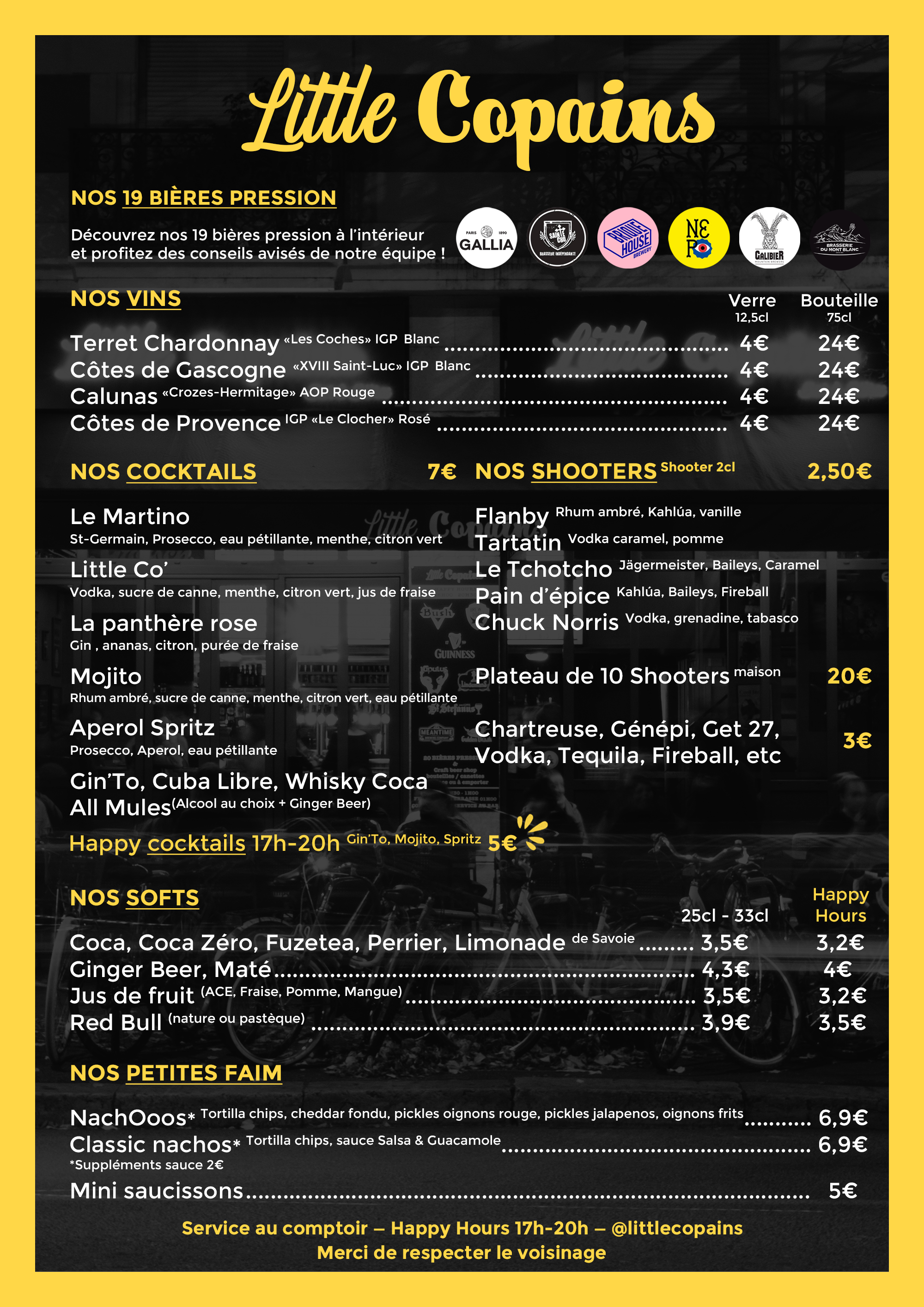 Venez découvrir le voisin des copains d'abord, le Little Copains, et plongez dans une atmosphère industrielle et conviviale ! Vous pourrez y goûter notre vingtaine de pressions autour d'une partie de baby foot, et si le coeur (et le foie!) vous en dit, une cinquantaine de bières craft accompagne notre carte ! À découvrir ou redécouvrir tous les jours, à l'étage comme en terrasse